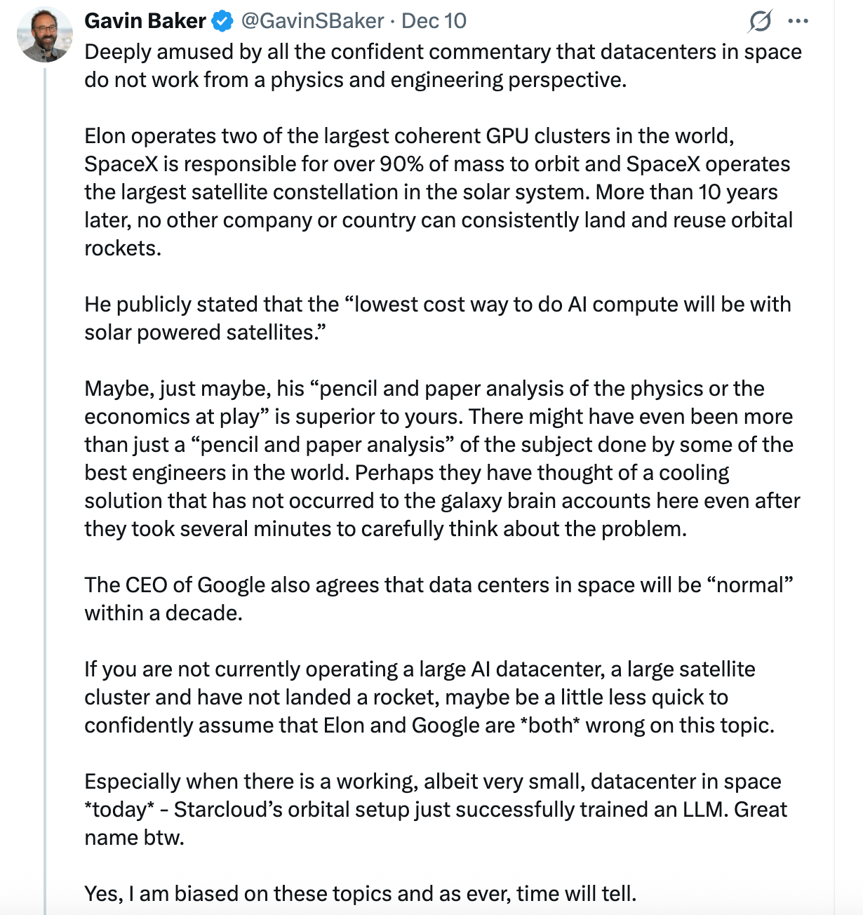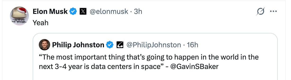 I’ll be the first to say that I don’t have the physics background to judge this on instinct. My initial reaction was the same as most people’s: “How can cooling in space possibly work if there’s no air?” I asked ChatGPT to walk me through the basics, expecting to confirm the conventional view. Instead, I ended up convinced that the first-principles argument is at least reasonable once you factor in radiative cooling at higher temperatures and the hard limits the Earth environment is running into. That said, I’m fully aware this is a complicated topic, and I’m happy to be challenged by people who actually work in thermal engineering or spacecraft design. If you think I’m missing something important, reply to the newsletter or message me and explain it to me. I’d genuinely like to learn.